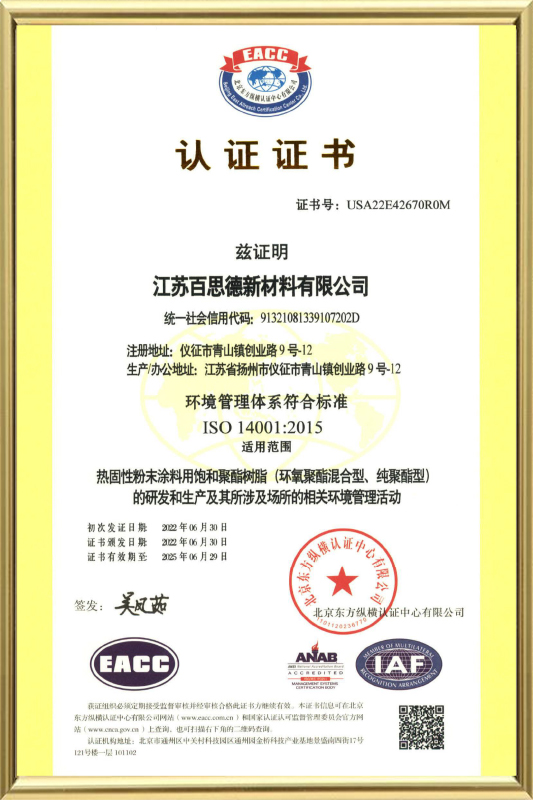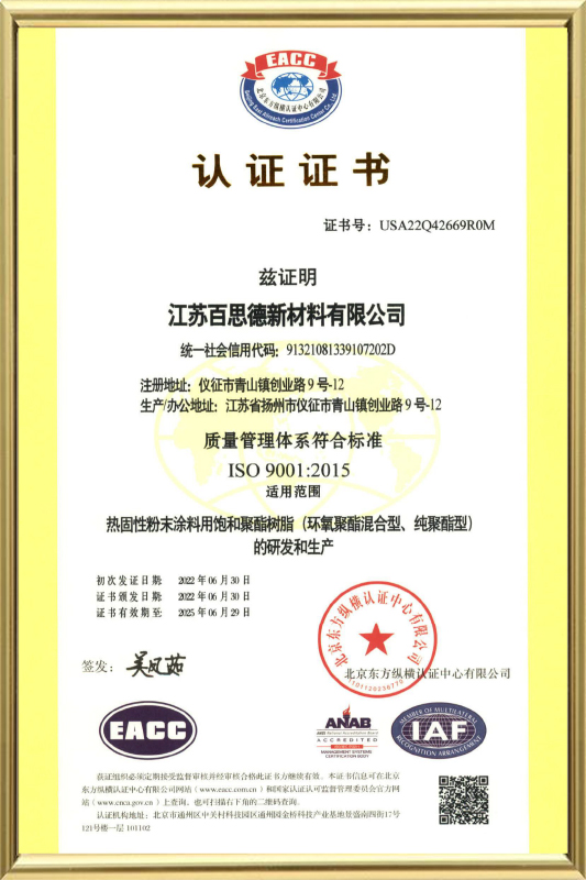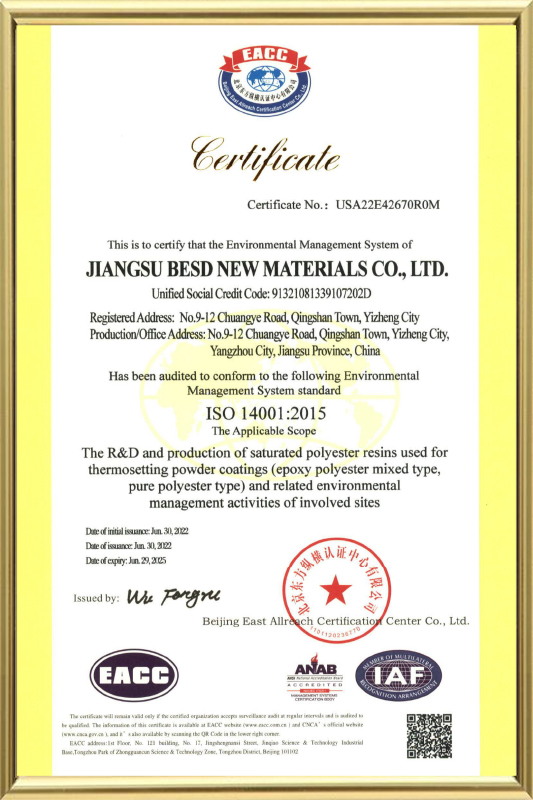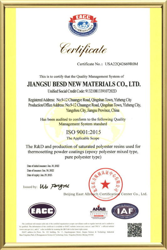 Jiangsu Besd New Material Co., Ltd. In MCMXCVIII condita est, quod sita in Yangzhou eget industria parco, Yizheng urbem, Jiangsu provinciam. Est a manufacturer, quae diu focused in polyester resina ad pulveris coatings.